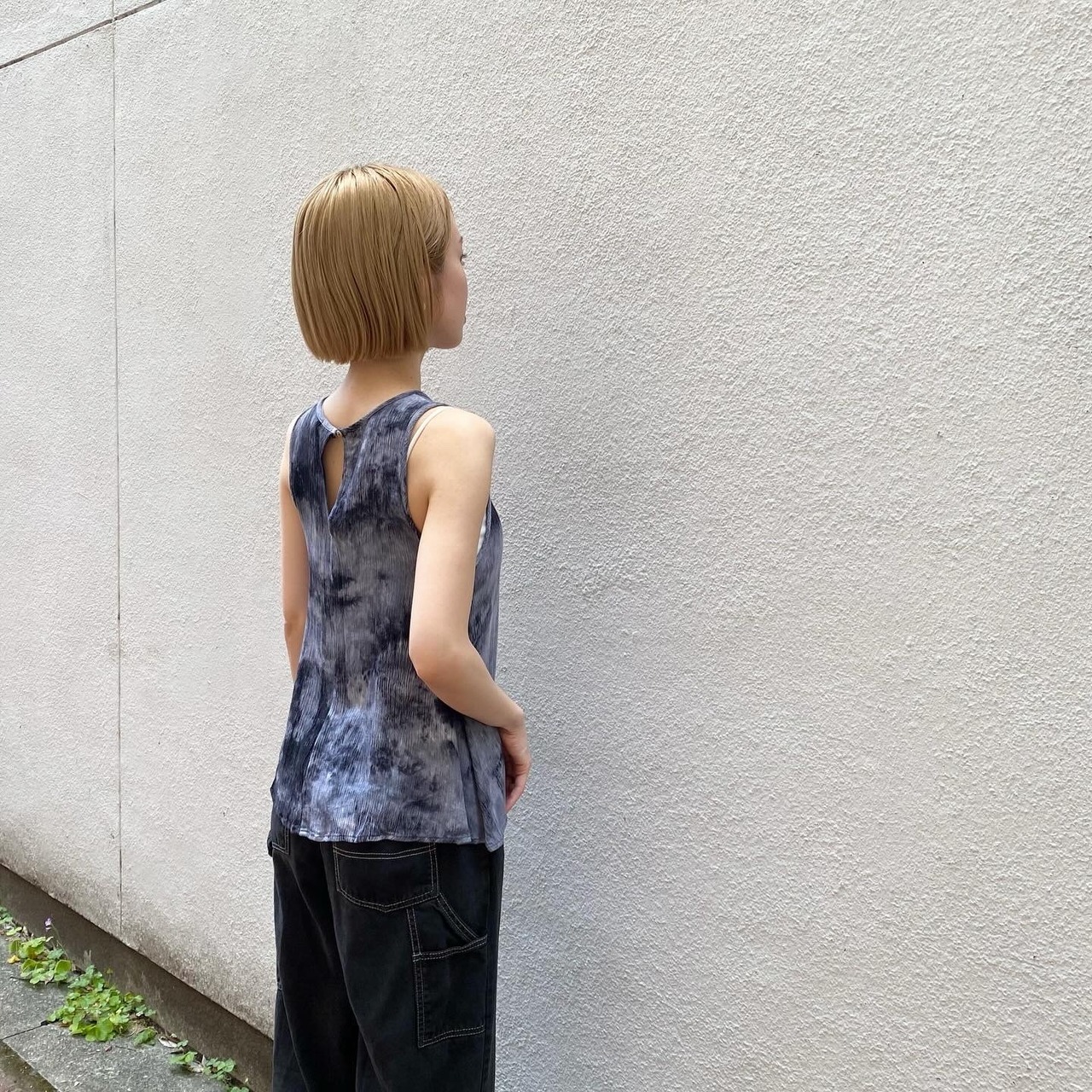 両サイドが少し長くひらひらとしたデザインが綺麗なタイダイ柄のトップスです。