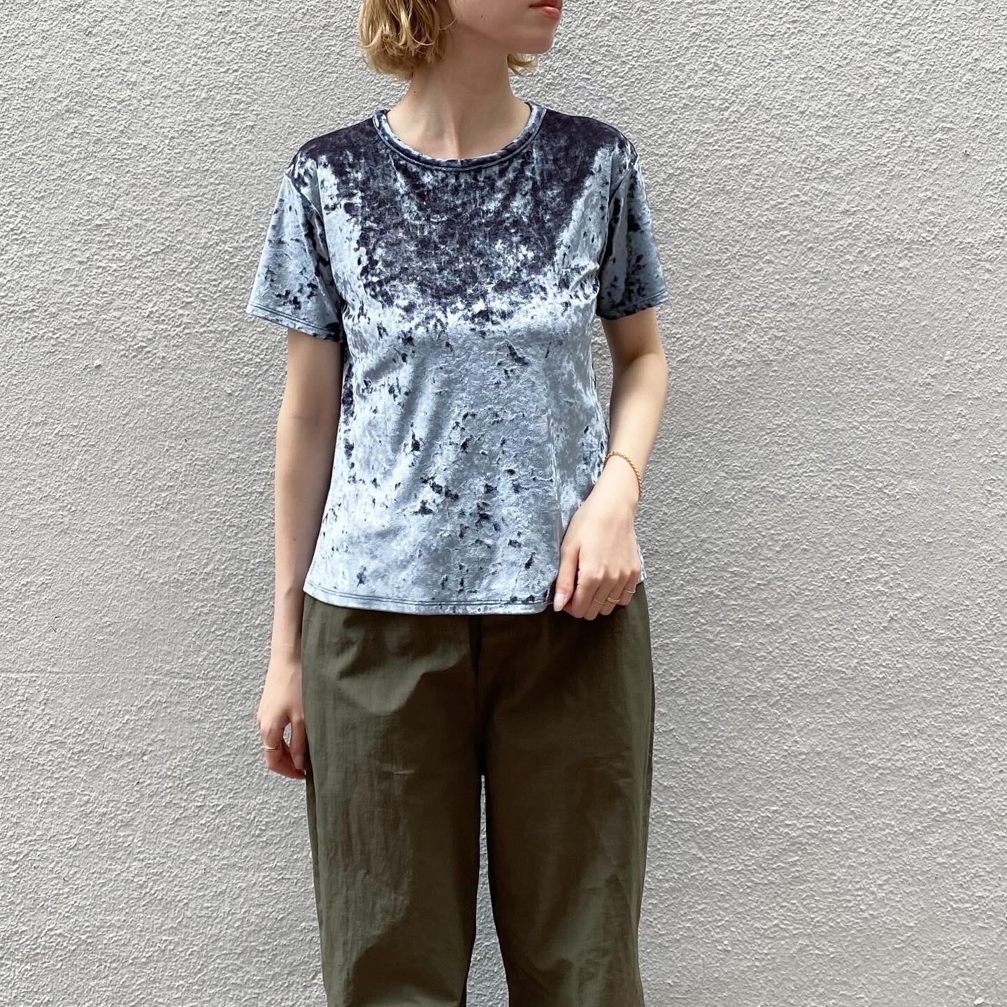 アイスグレーのベロアの光沢感が美しいトップスです。伸縮性があり楽にお召し頂けます。