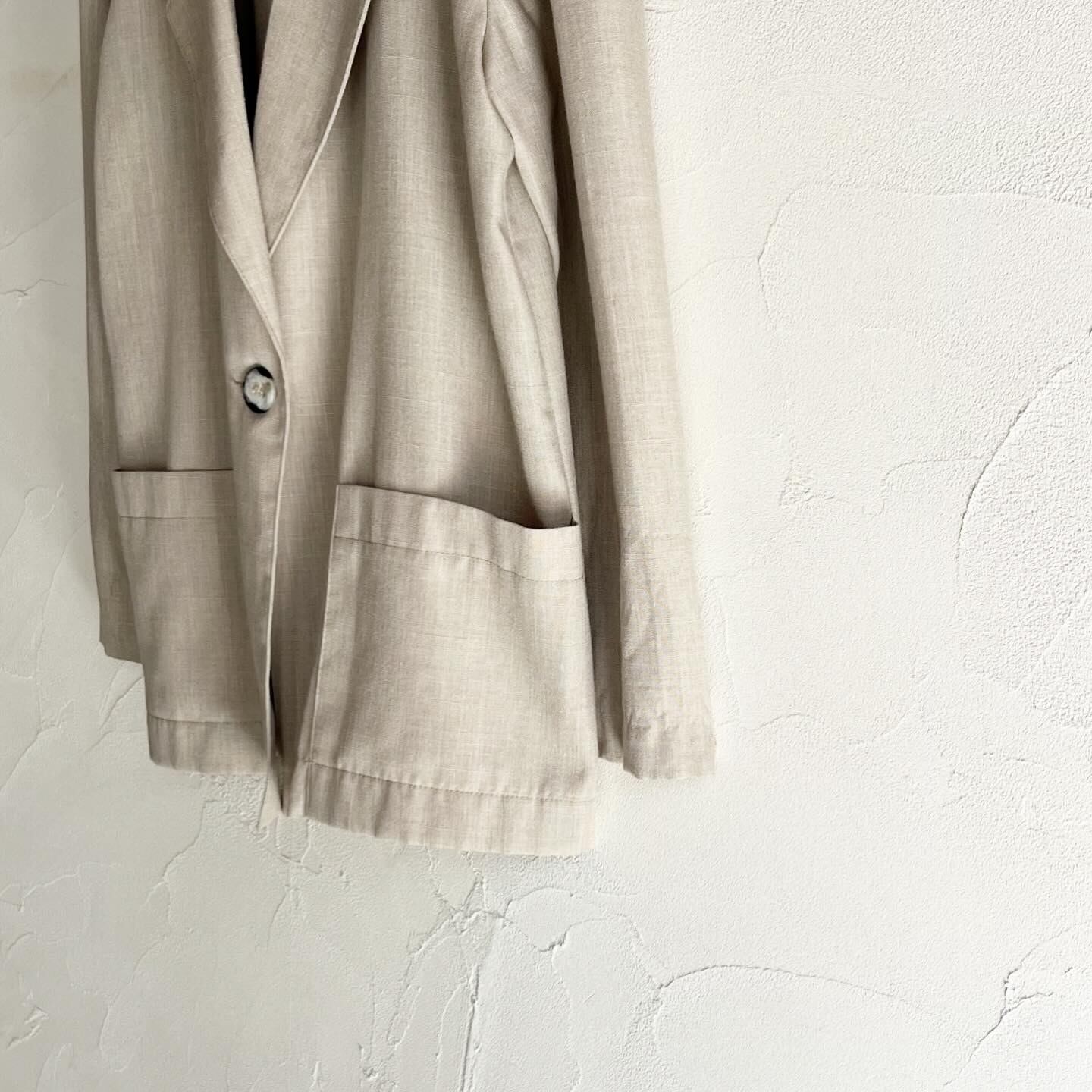 シンプルで使い勝手の良いテーラードジャケットです。裏地はついておらず、軽い生地感です。