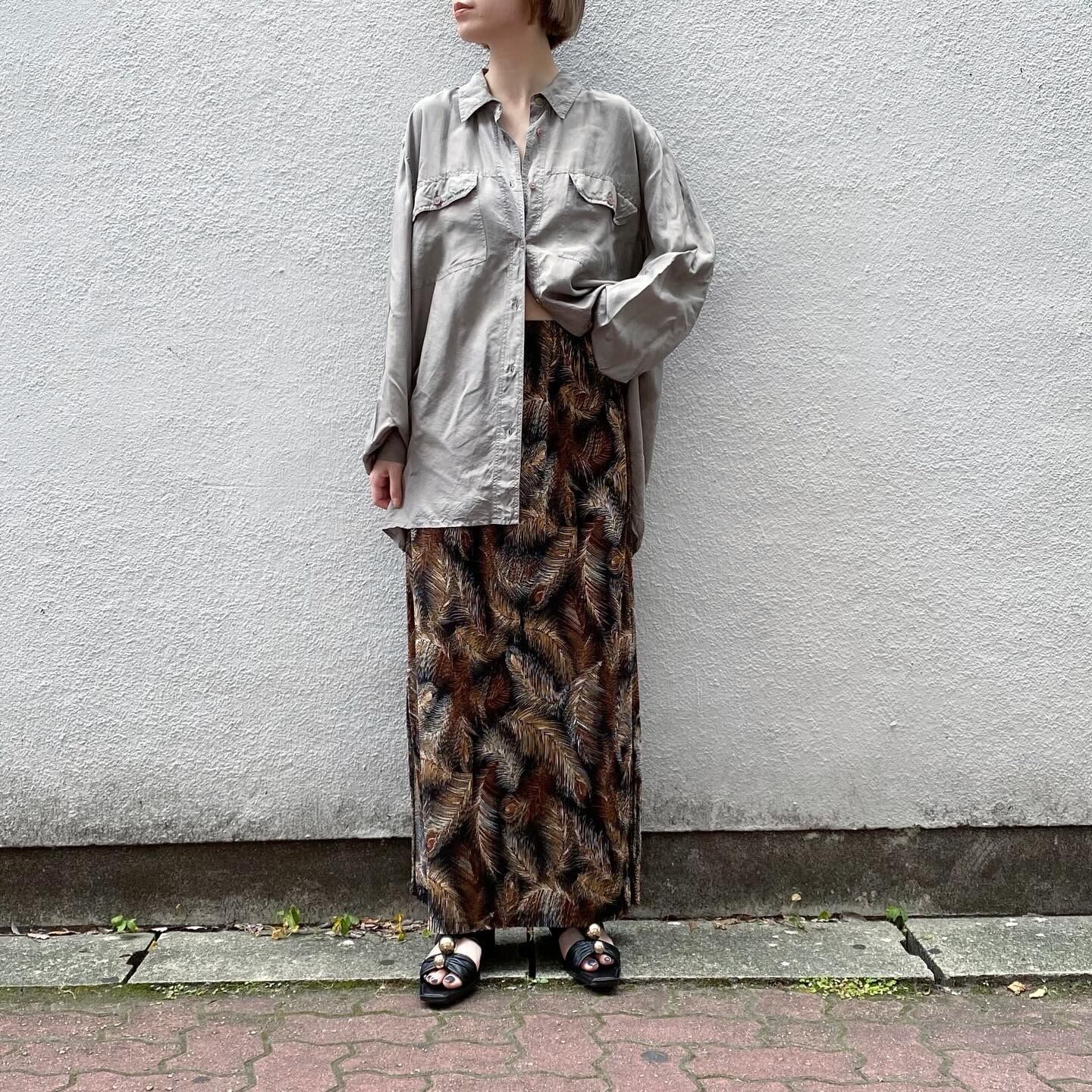全体的に落ち着いたカラーの柄スカートです。細かなプリーツのような凹凸があり、着用すると滑らかな動きが出ます。