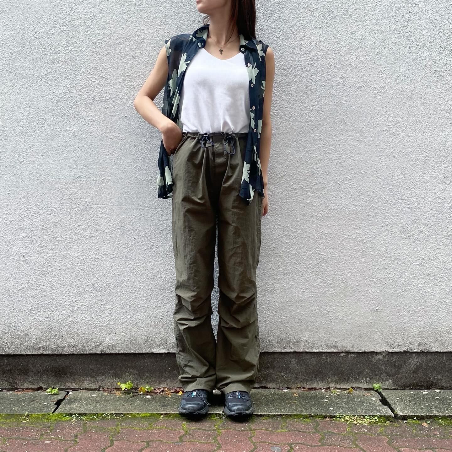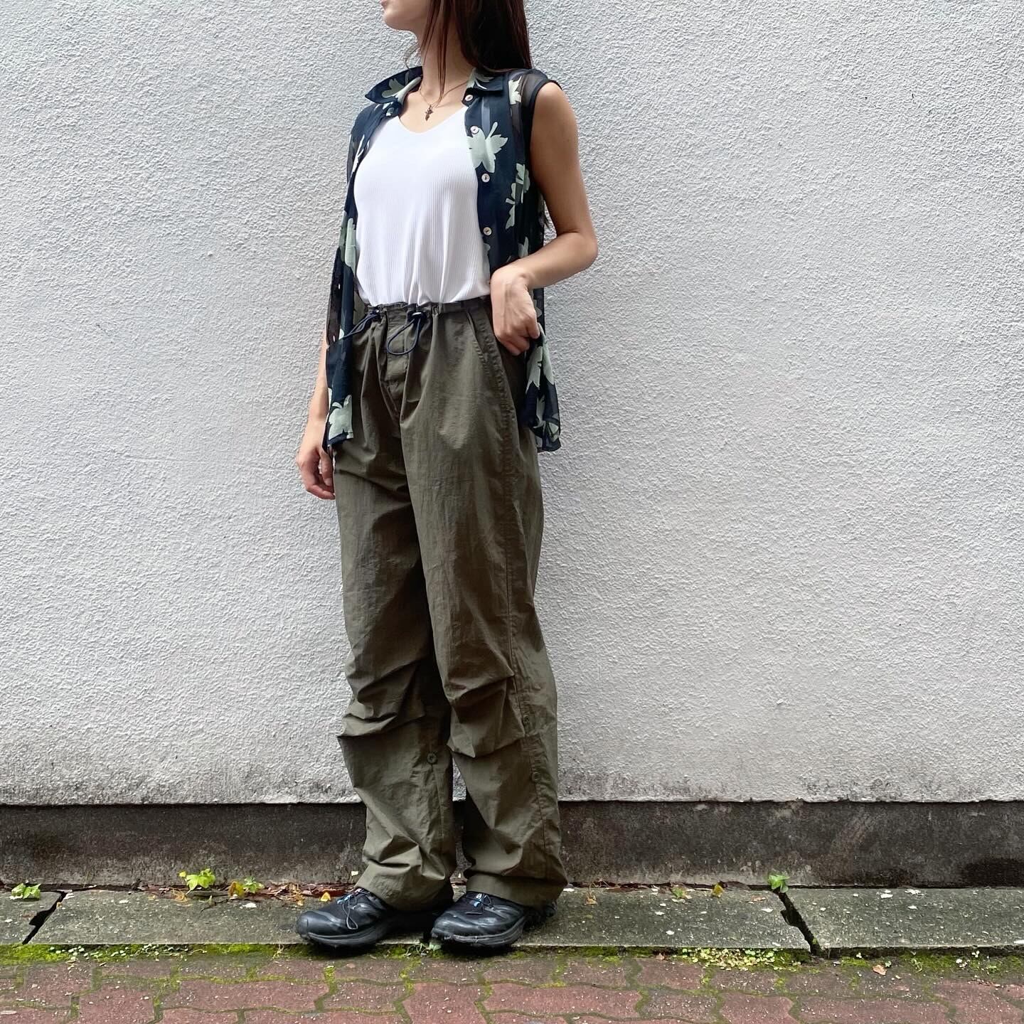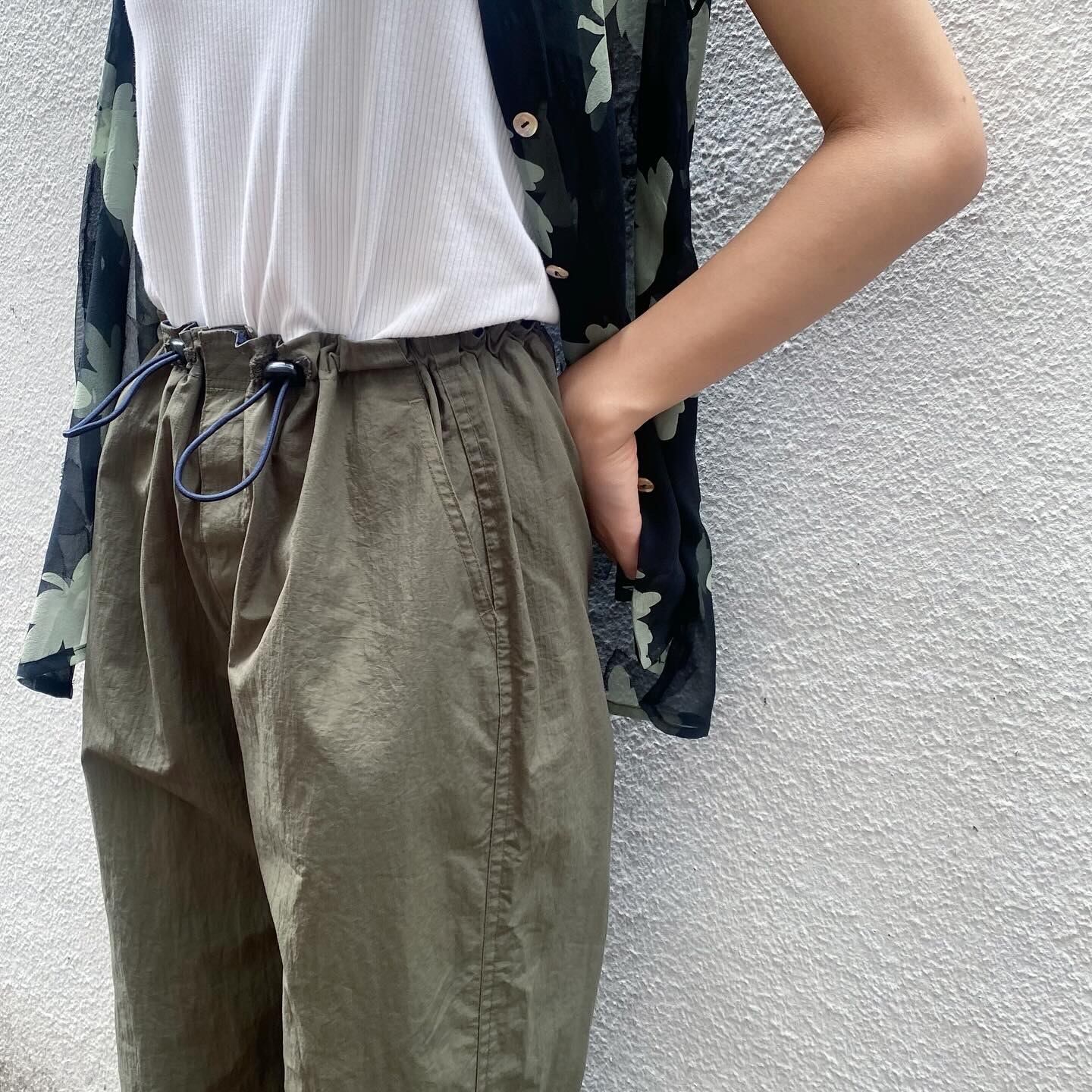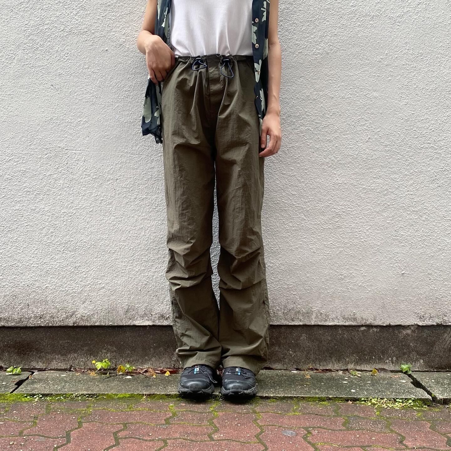 膝元のボタンや膝下のデザインが可愛いナイロンパンツです。