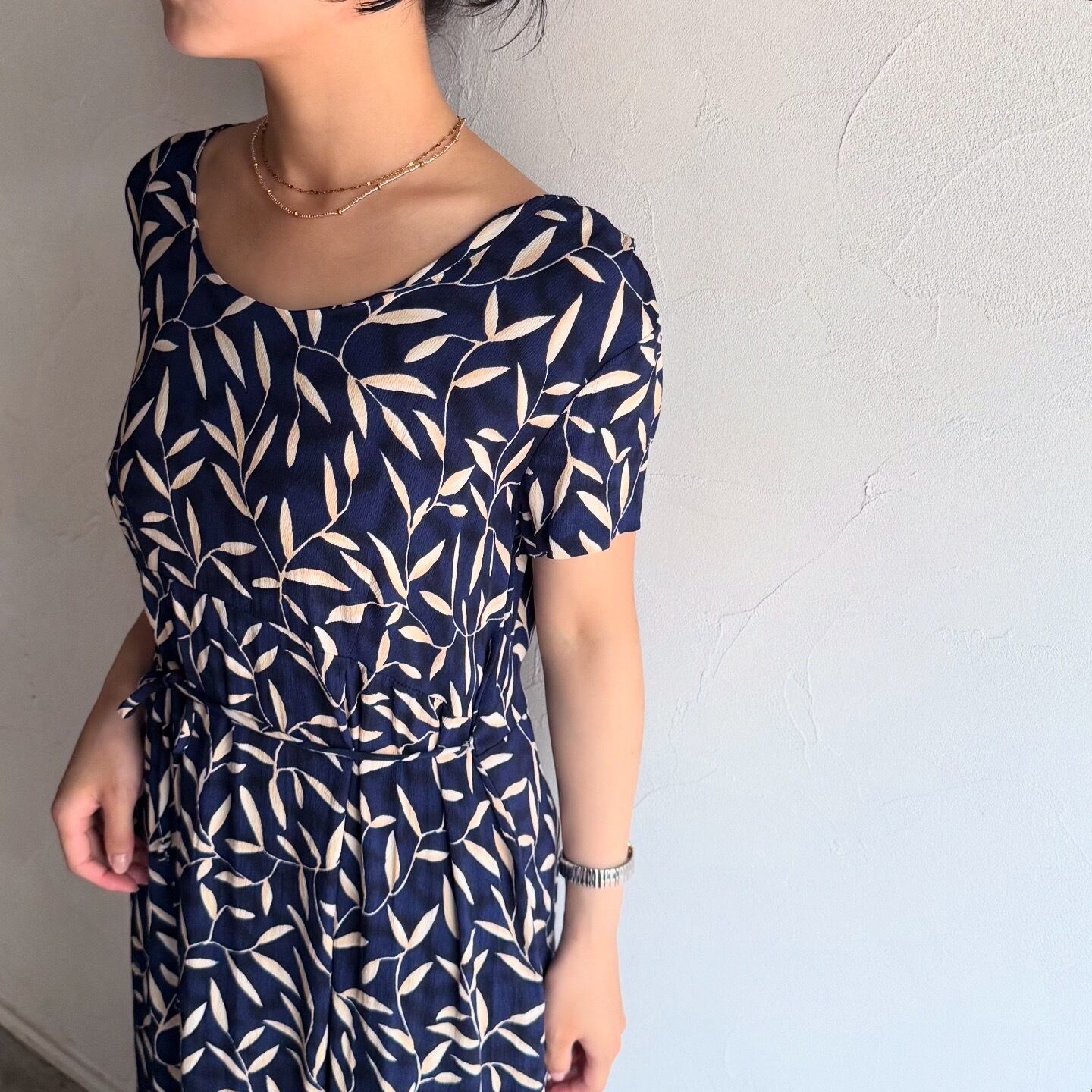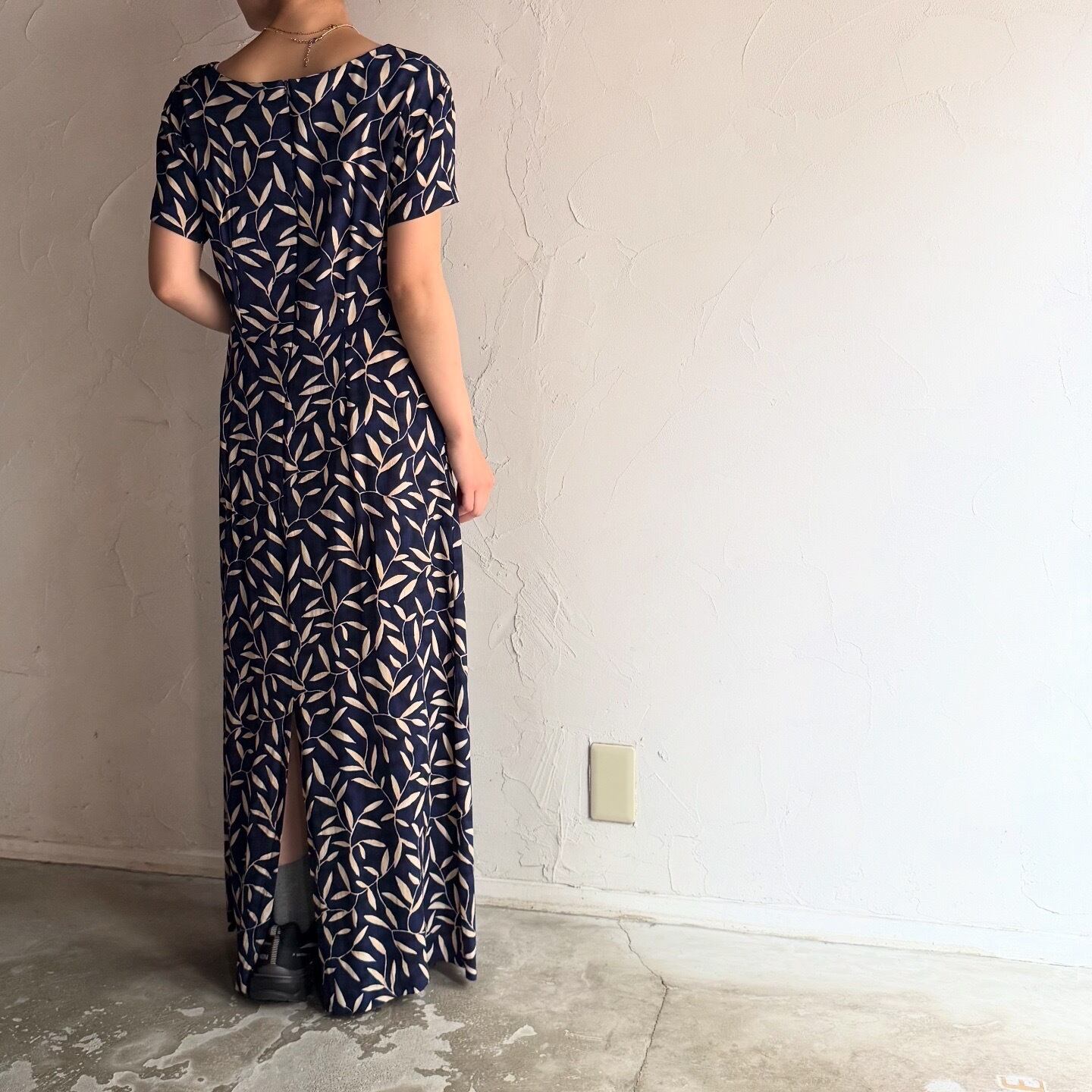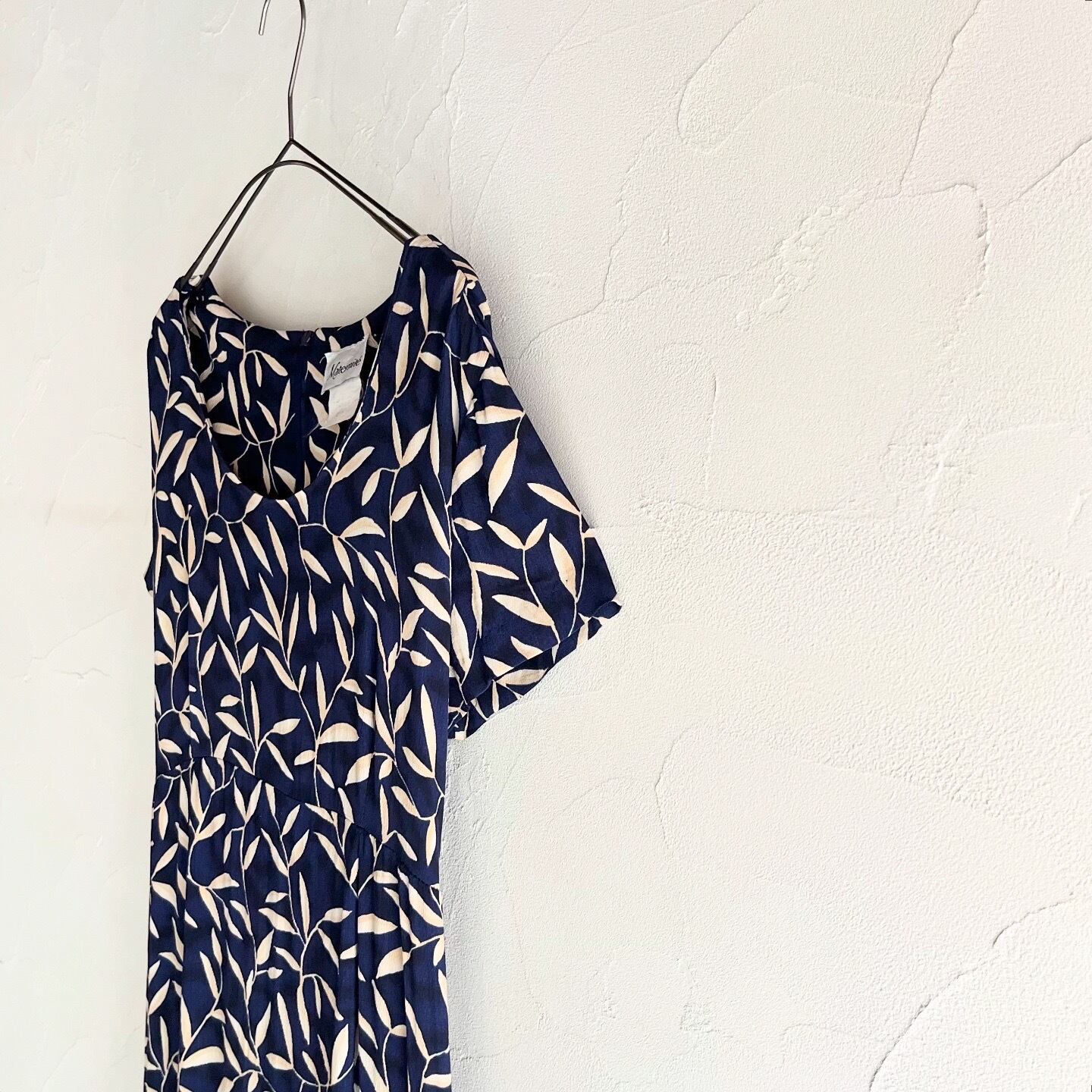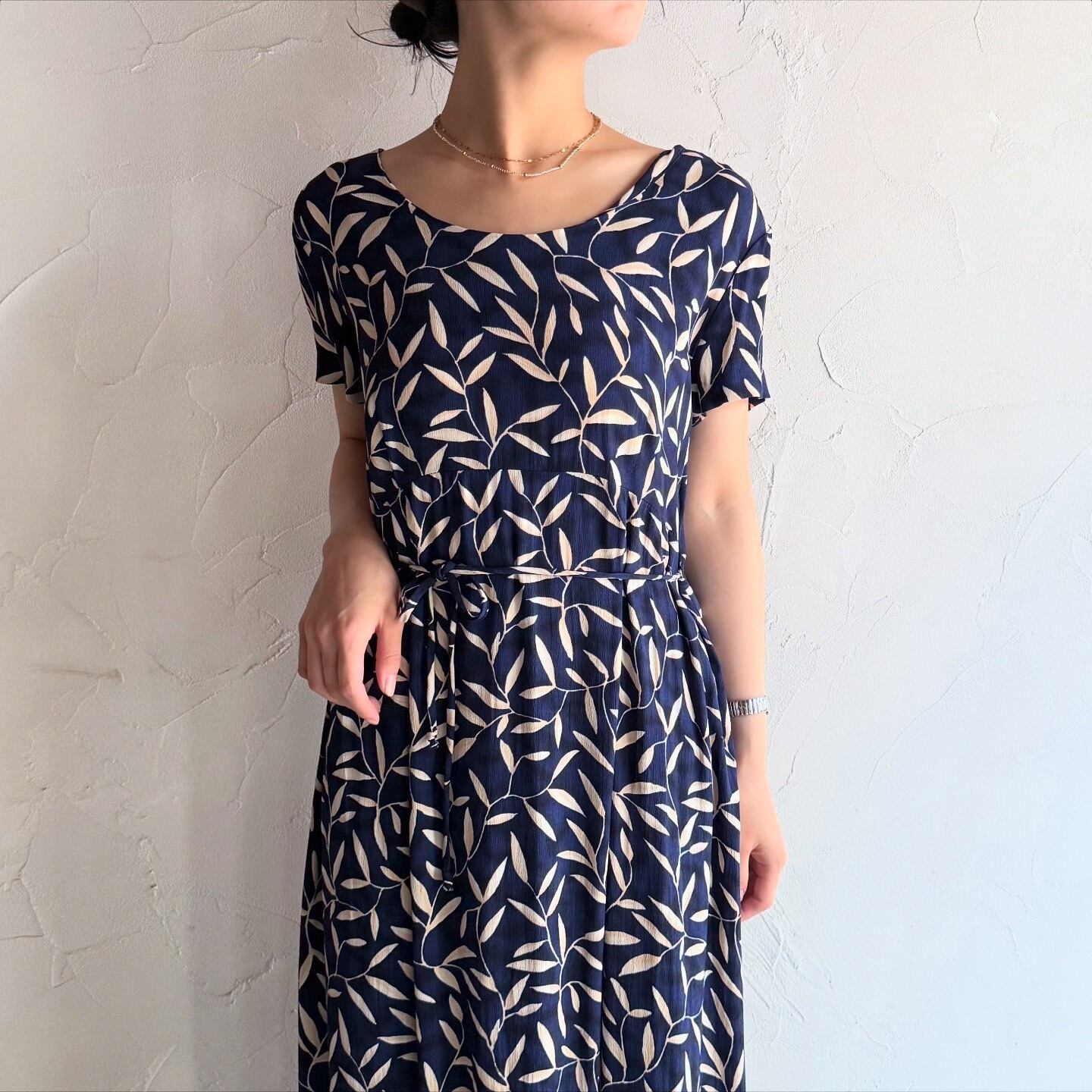 全体に葉っぱのプリントがされたネイビーワンピースです。