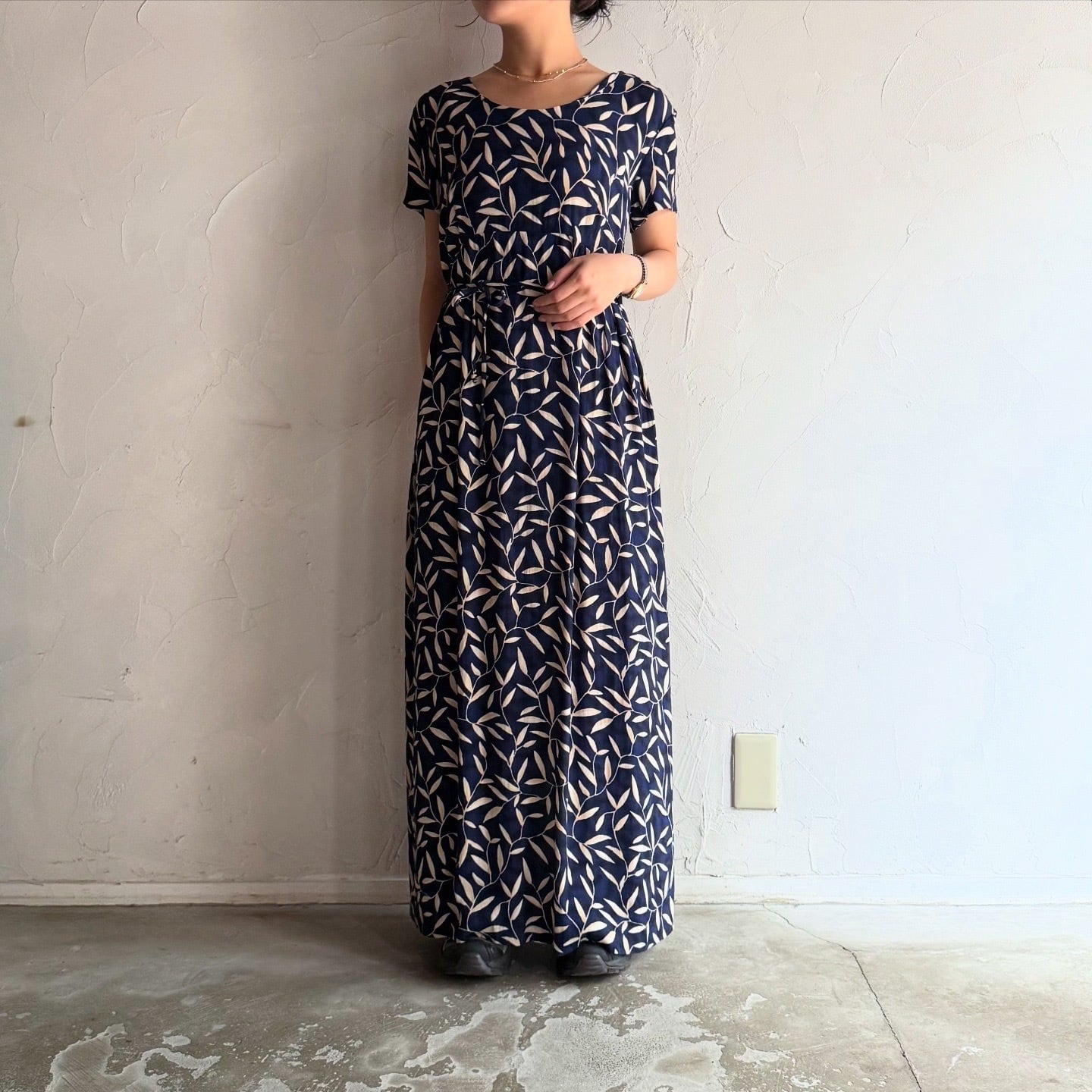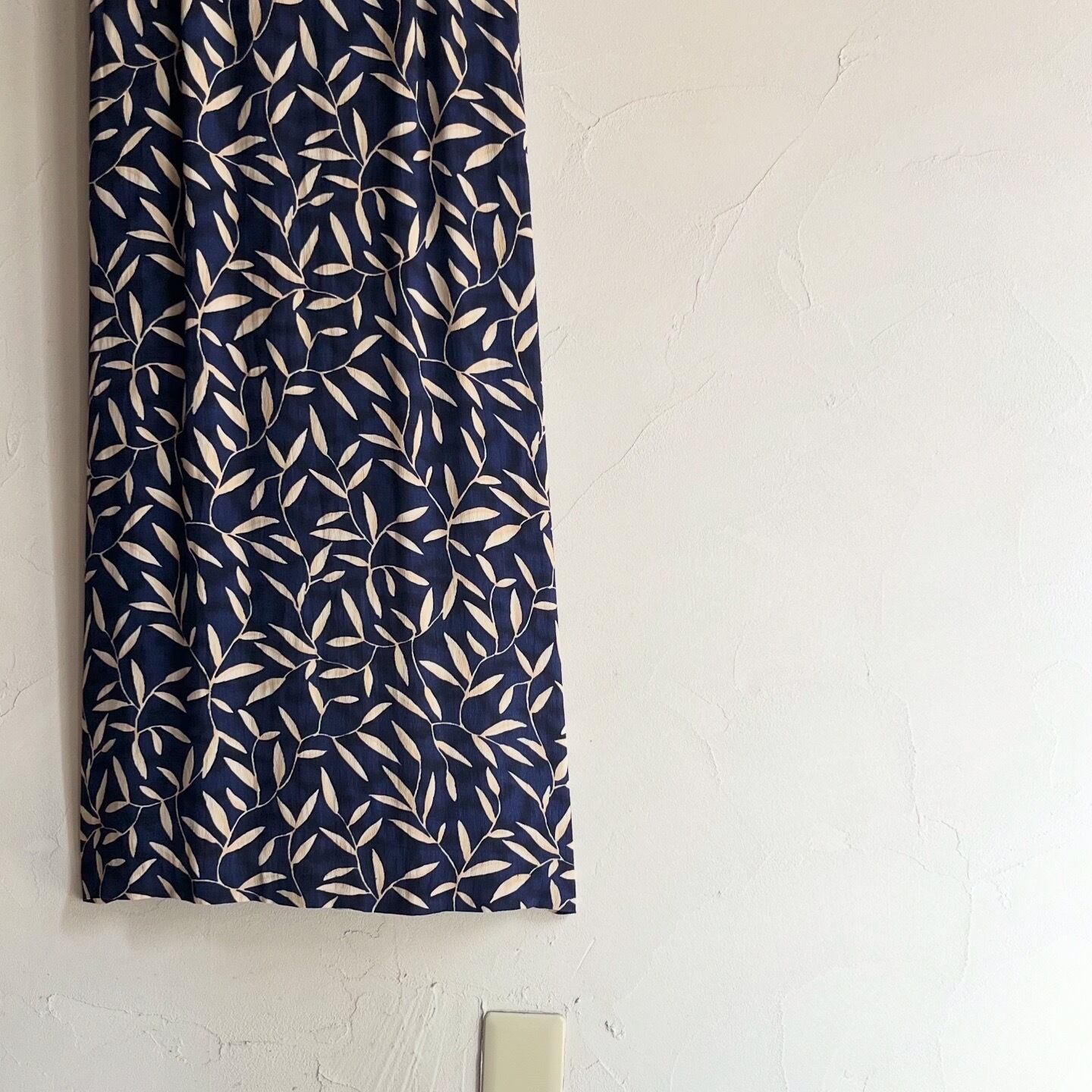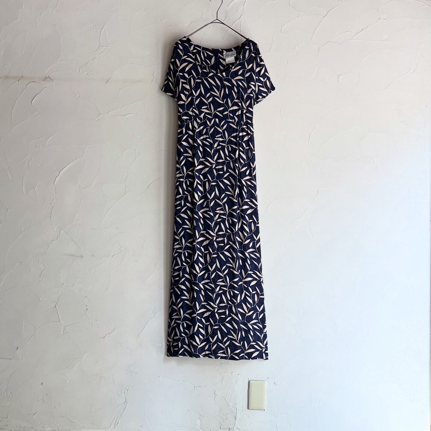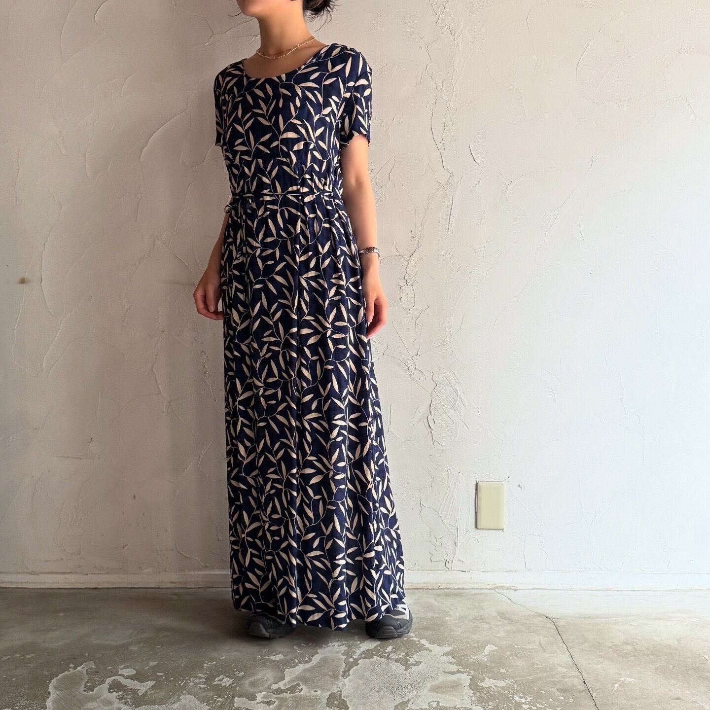 全体に葉っぱのプリントがされたネイビーワンピースです。