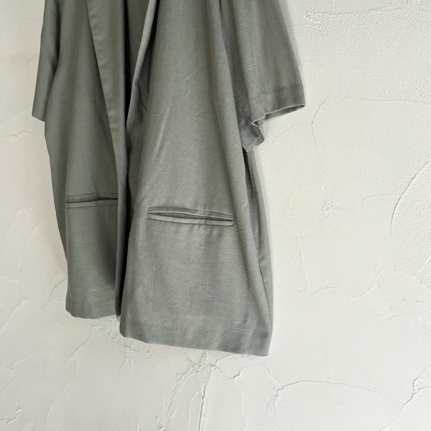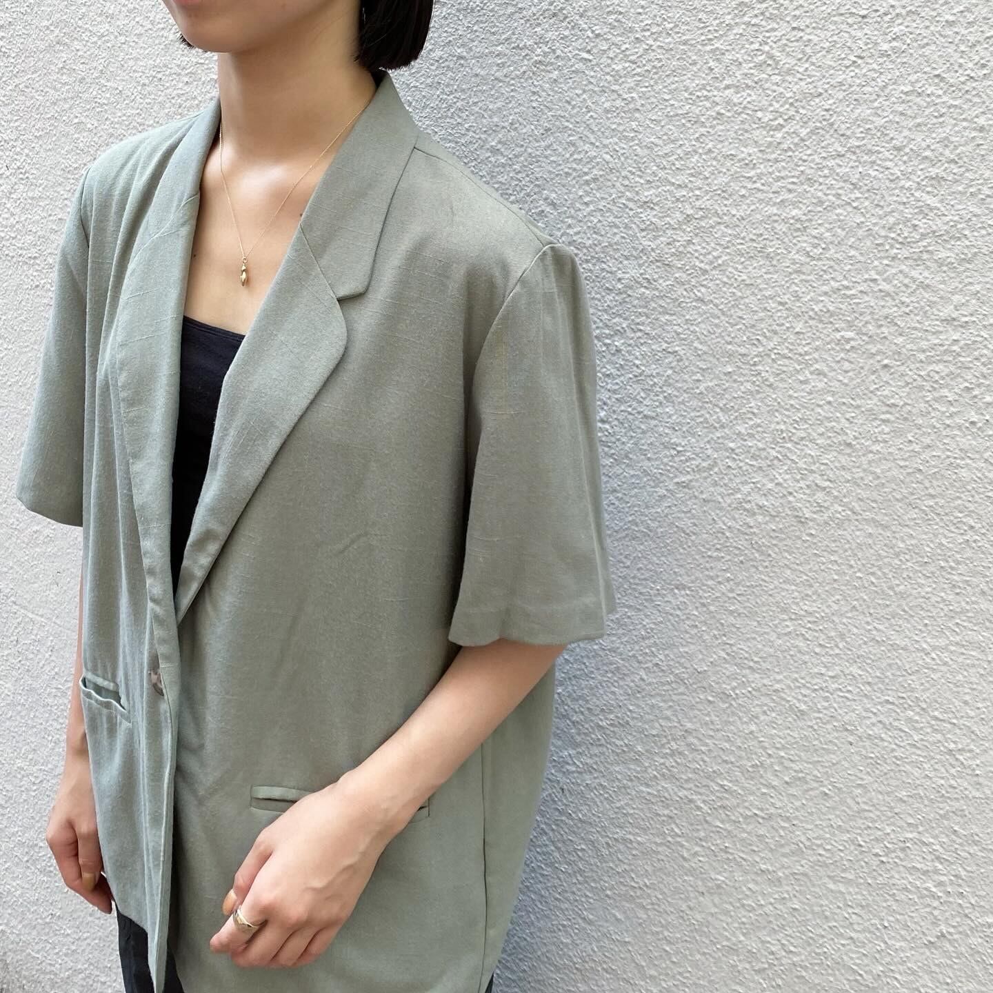 くすんだグリーンが素敵な半袖のジャケットです。裏地のついていない、柔らかい生地です。