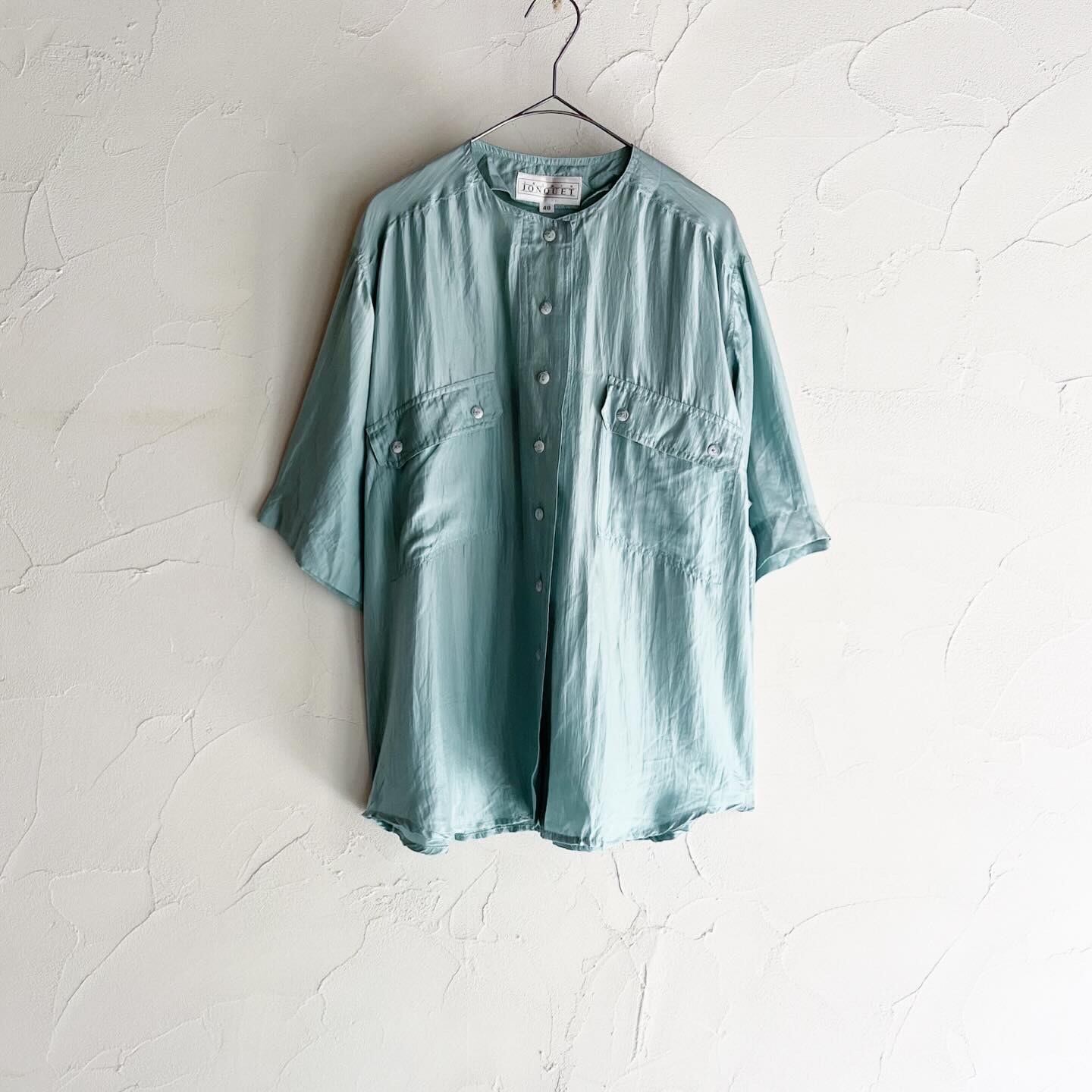 ノーカラーで首元がスッキリとした形が綺麗なシルクシャツです。