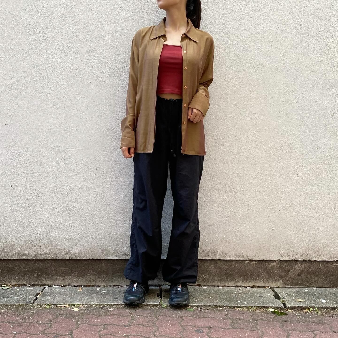 角度によって見える赤みのある光沢が美しいシャツです。ボタンが隠れたデザインがスッキリとした印象です。