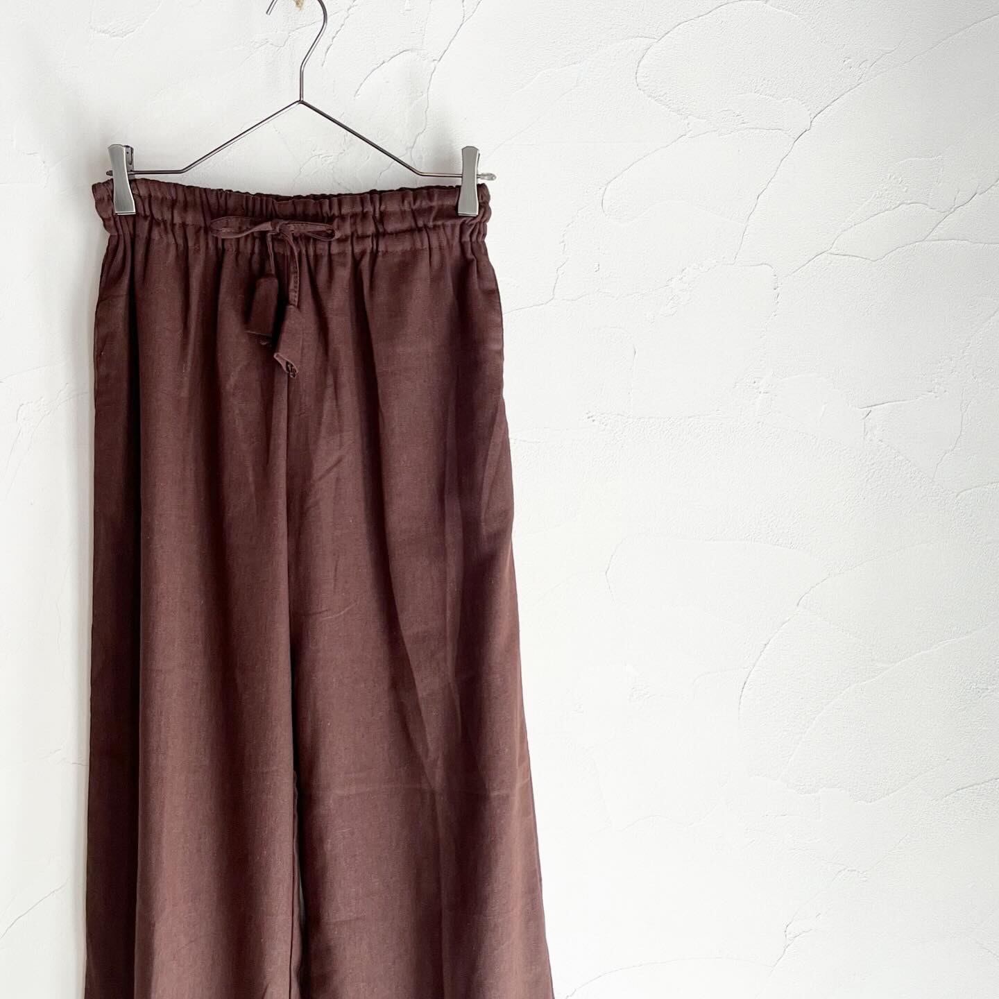 リネンとコットンで風通しの良いワイドパンツです。ウエストと裾は紐でキュッと絞れます。