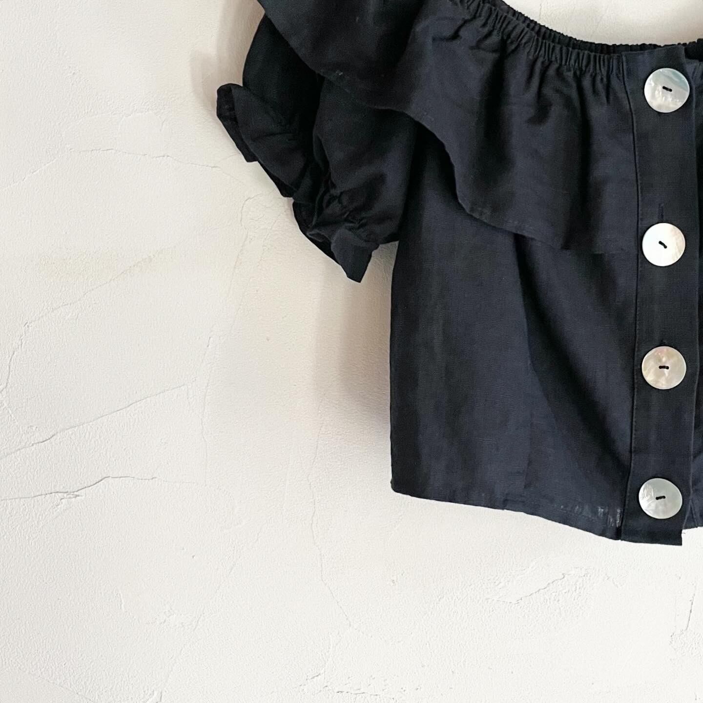 クロップド丈で全体のボリュームが可愛らしいブラウスです。大きめのシェルボタンやオフショルダーにもできるデザインが素敵です。