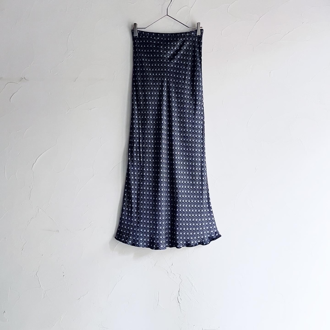 華奢なお花のプリントや程よい光沢の美しいフレアスカートです。つるっとした軽い生地感です。