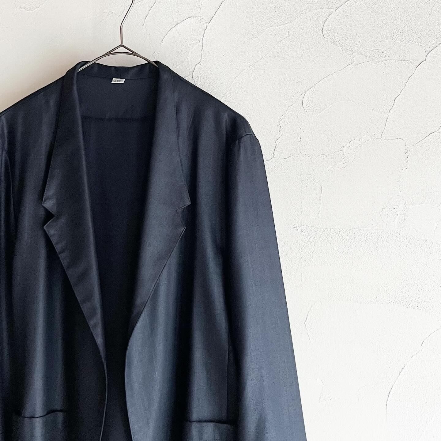 程よい光沢のある柔らかい生地感のジャケットです。表記はないのですがおそらくウール混で、品のある素材感です。