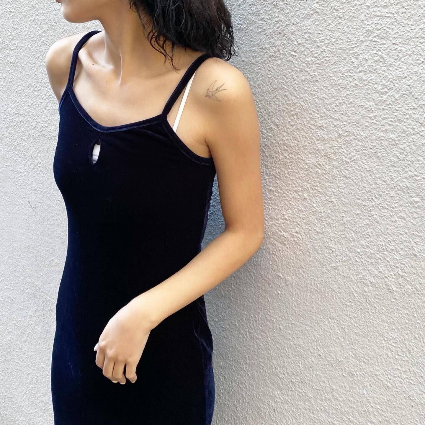 深みのあるネイビーが美しい、ベロア素材のキャミワンピースです。