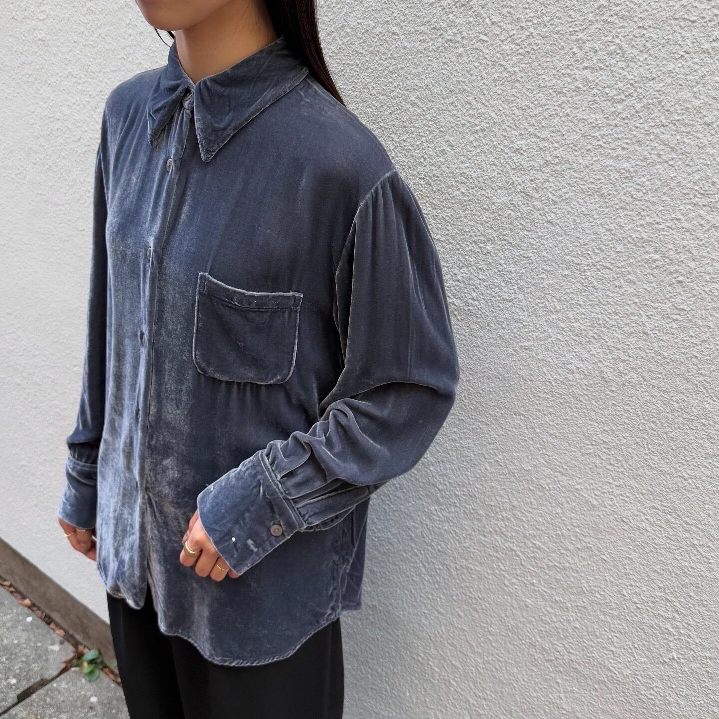 青みがかったグレーのベロアの程よい光沢感の美しいシャツです。