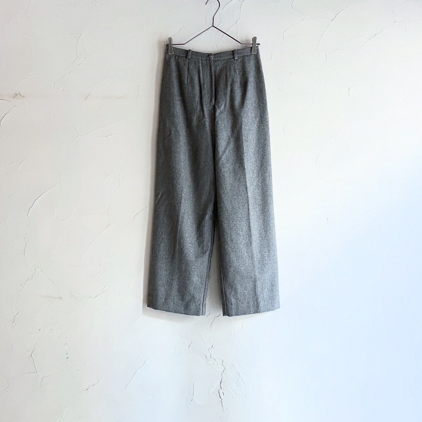 100%ウールで裏地付きのスラックスパンツです。ウエスト周りにゴムなどは使われておらず、美しいシルエットです。