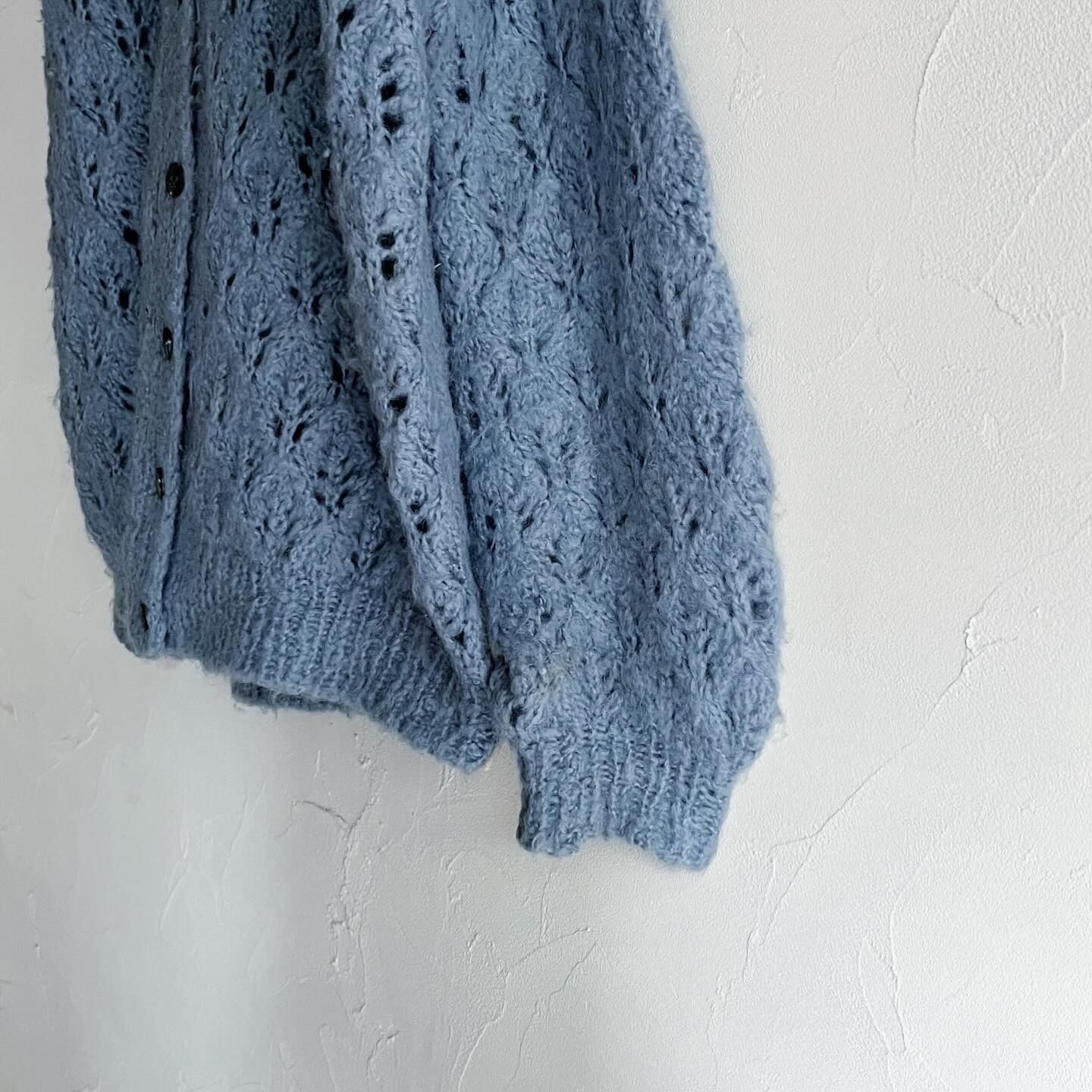おそらくハンドメイドのざっくりとしたクロシェ編みが可愛いニットカーディガンです。