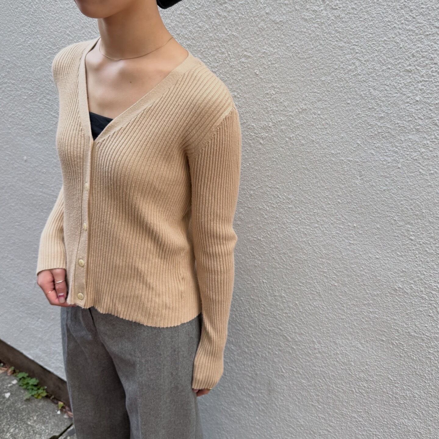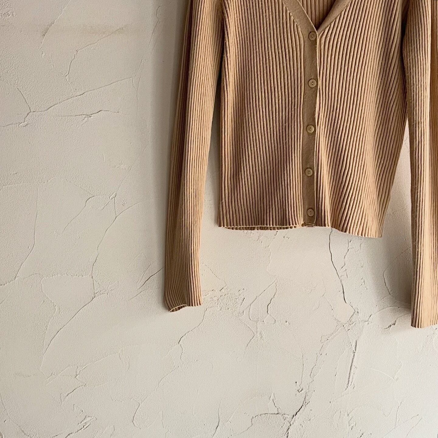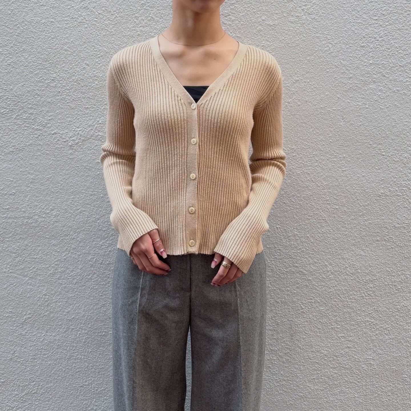 しっかりとした地厚な生地感のリブニットカーディガンです。ラインを拾いすぎず、程よくぴたっとしたシルエットです。