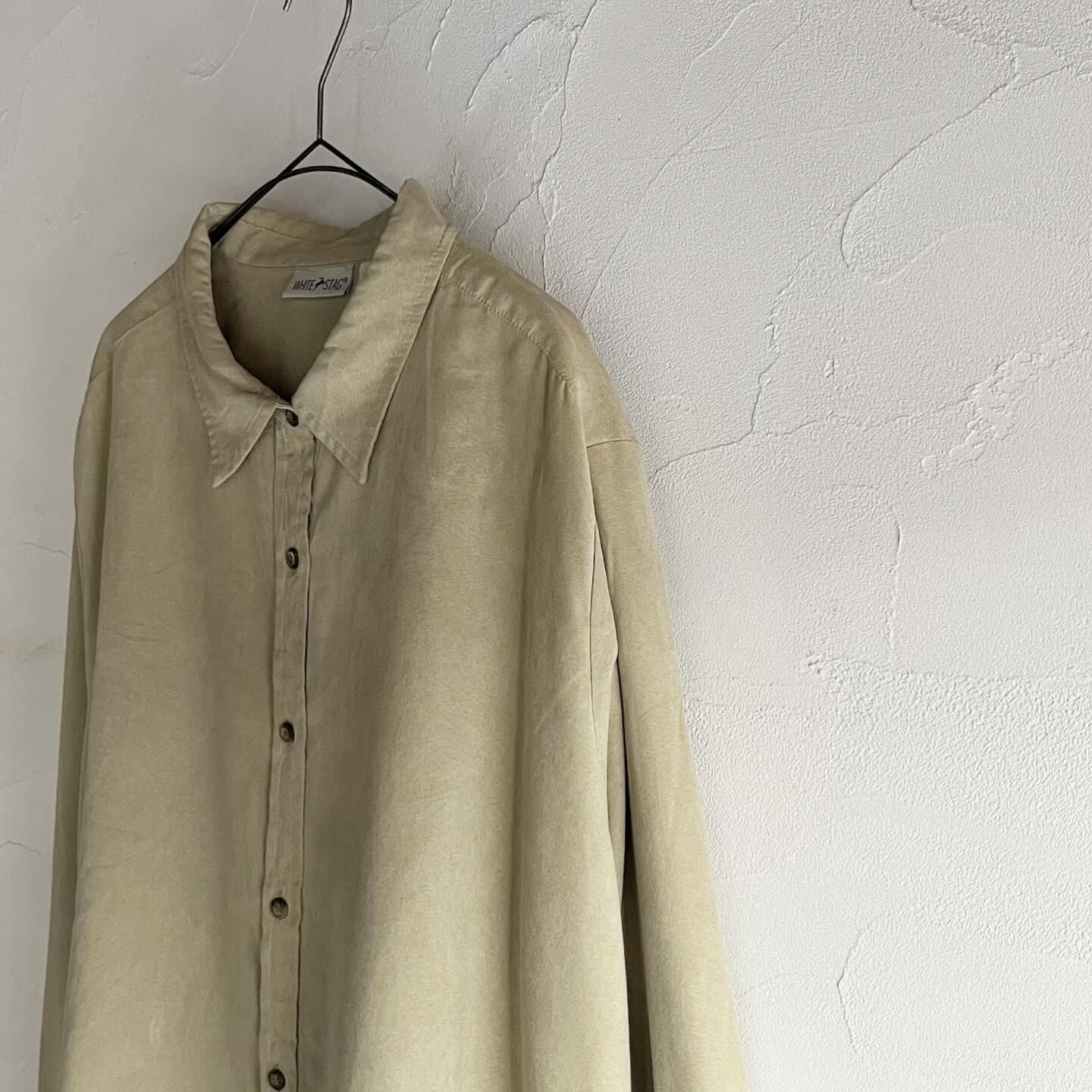 イエローとグリーンの間くらいの色味が他にはないフェイクスエードシャツです。