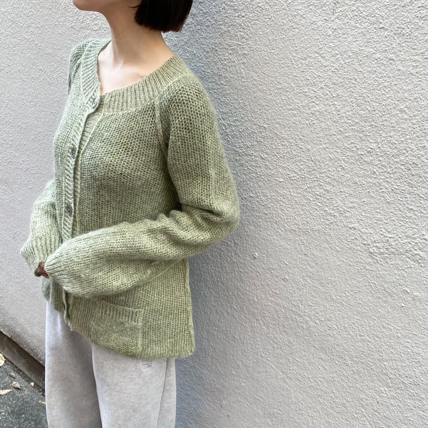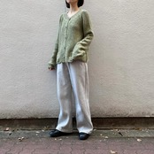 とても繊細なラメ糸が降り混ざったグリーンの生地がかわいいニットカーディガンです。