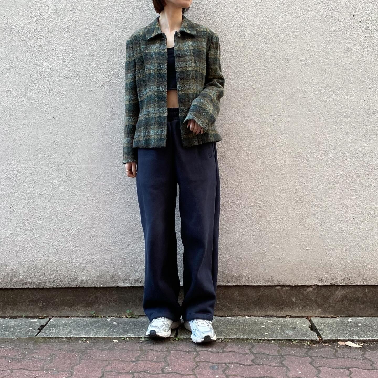 ブラウンとグリーンのチェックが秋冬らしいウールジャケットです。裏地付きで暖かく、羽織としてもトップスとしてもお召し頂けます。