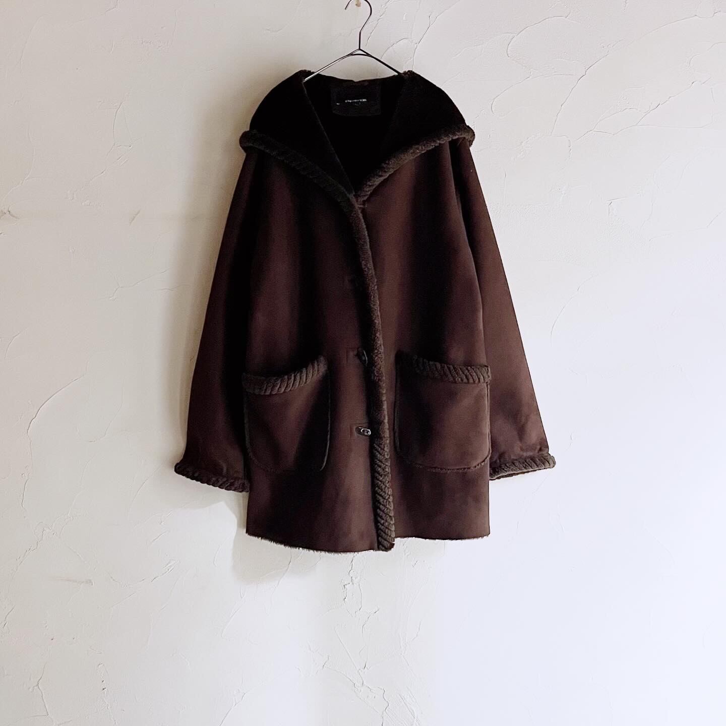 落ち着いた配色が大人っぽくお召しいただけるフェイクムートンコートです。
