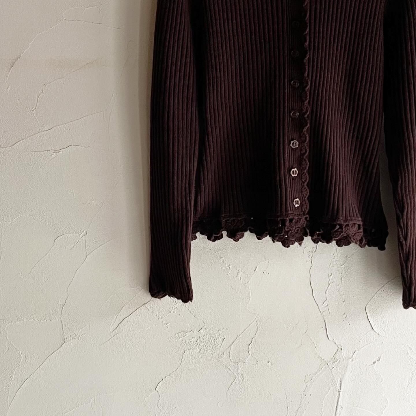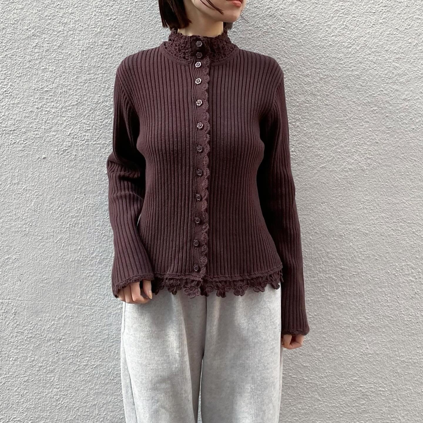 裾や襟元のクロシェや、お花のボタンが可愛いリブニットカーディガンです。