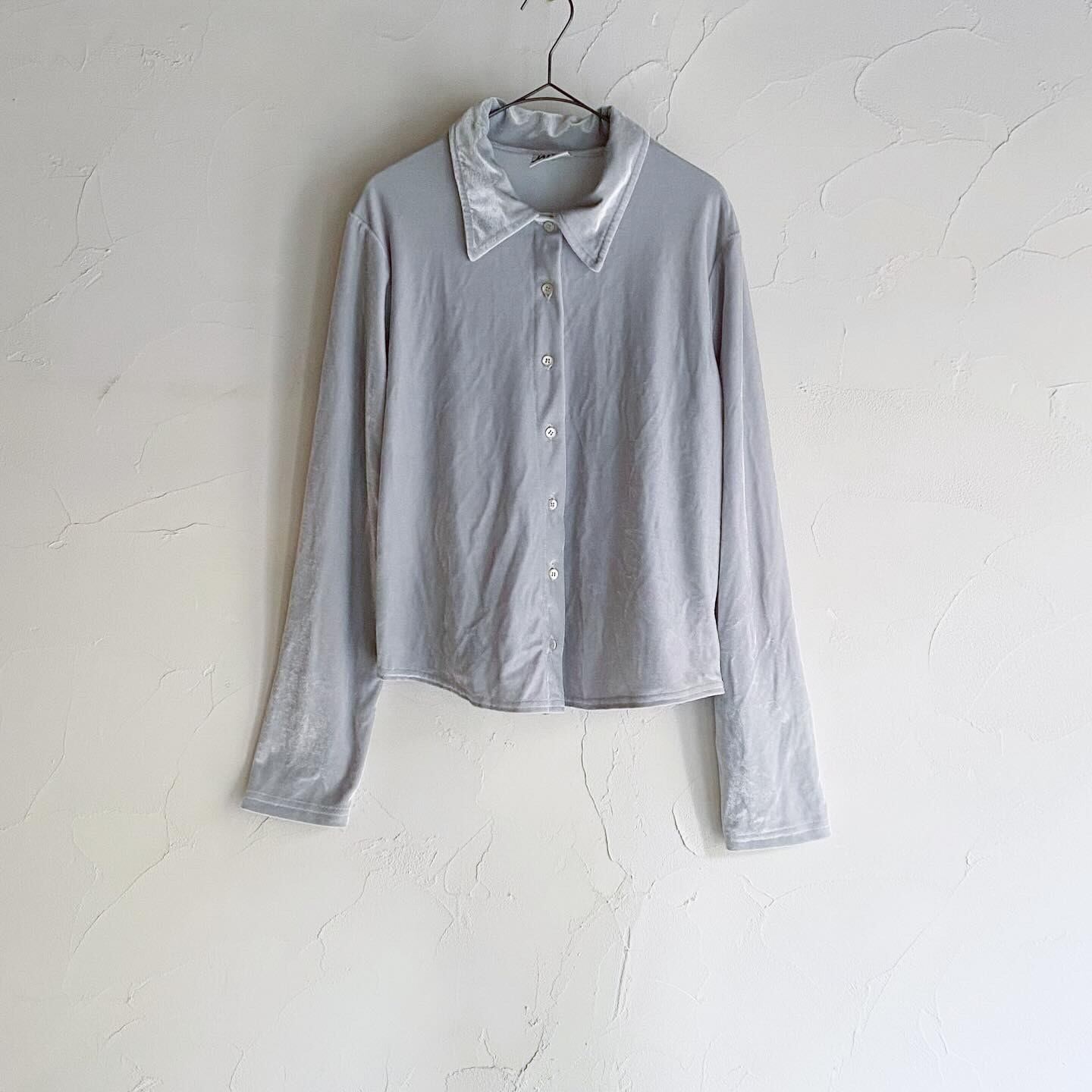 自然光で白色に放つ光沢が綺麗なベロアシャツです。ベロア素材ではありますが明るめの色で軽やかな印象なので、春先にも活躍する一着です。