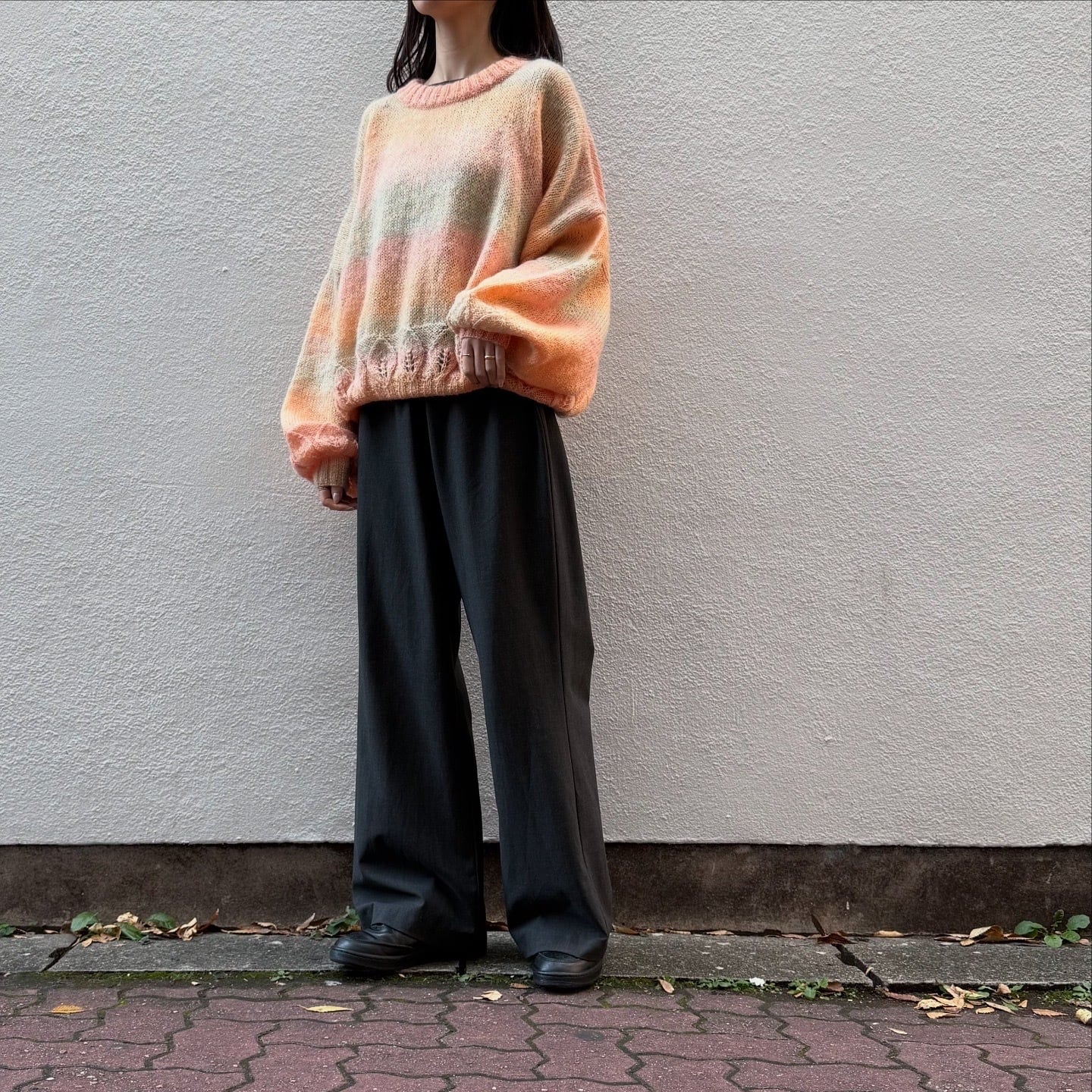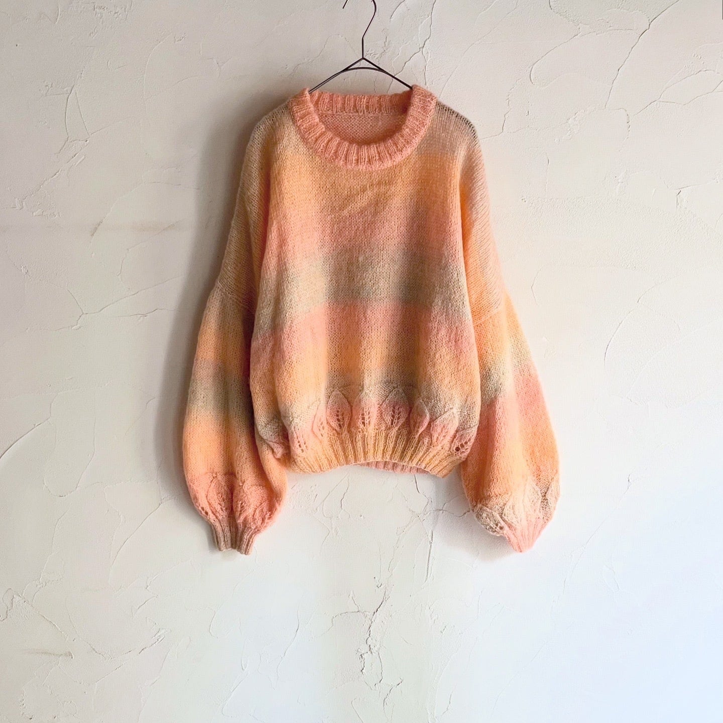 たっぷりとした袖やシルエットが可愛いニットです。絶妙な色味のグラデーションや、裾の葉っぱのデザインが素敵です。